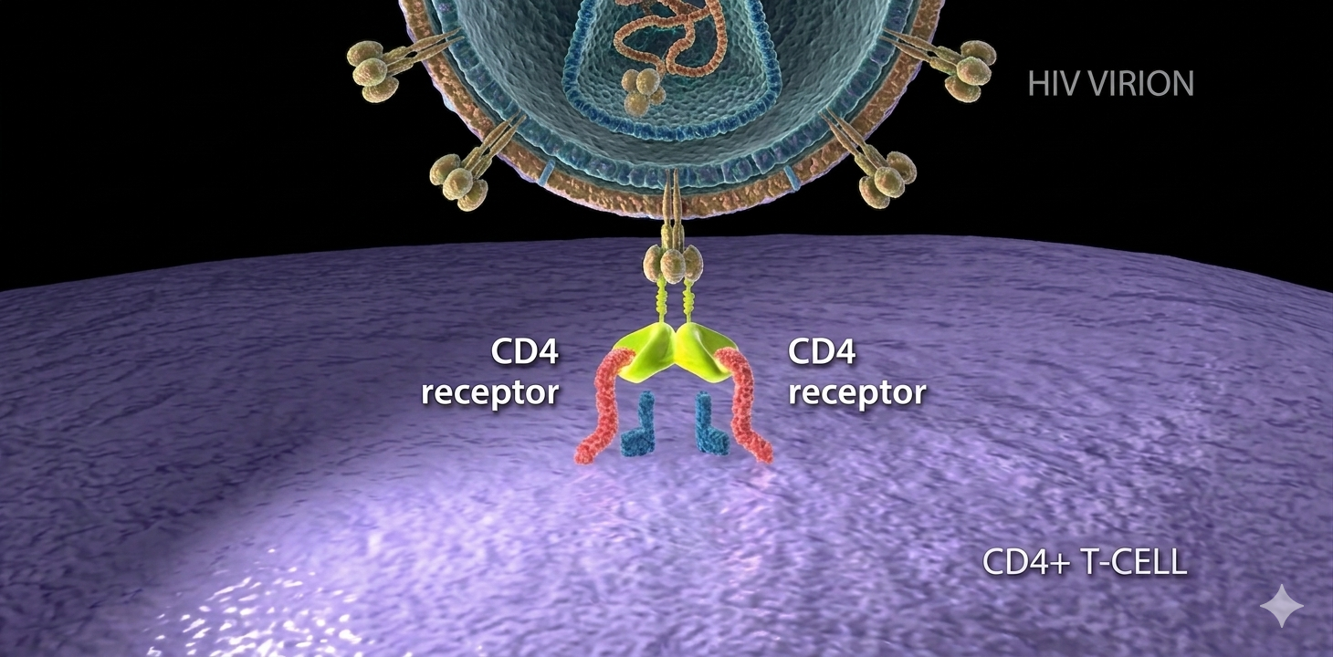 - Thụ thể chính (Primary Receptor) - CD4: Đây là điểm tiếp xúc đầu tiên. Protein gp120 trên lớp vỏ của HIV sẽ liên kết với phân tử CD4 trên bề mặt tế bào lympho T. Tuy nhiên, sự liên kết này đơn thuần mới chỉ là bước "neo đậu", chưa đủ để virus hòa màng.