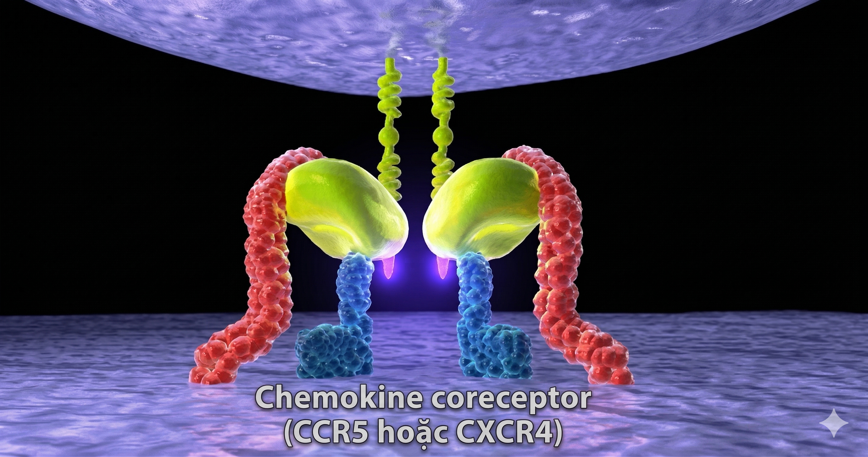 - Đồng thụ thể (Co-receptors) - CCR5 hoặc CXCR4: Để thực sự mở cánh cửa đi vào tế bào, HIV bắt buộc phải liên kết thêm với một đồng thụ thể là CCR5 hoặc CXCR4